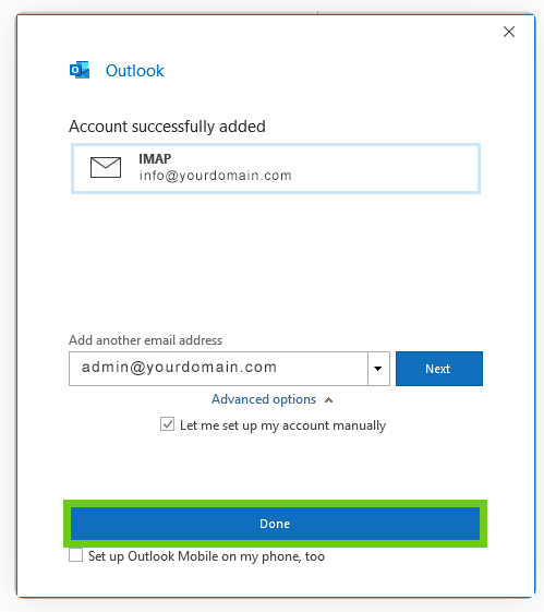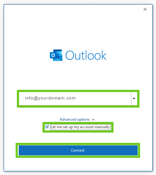 Select ‘Advanced options’, then select ‘Let me set up my account manually’.